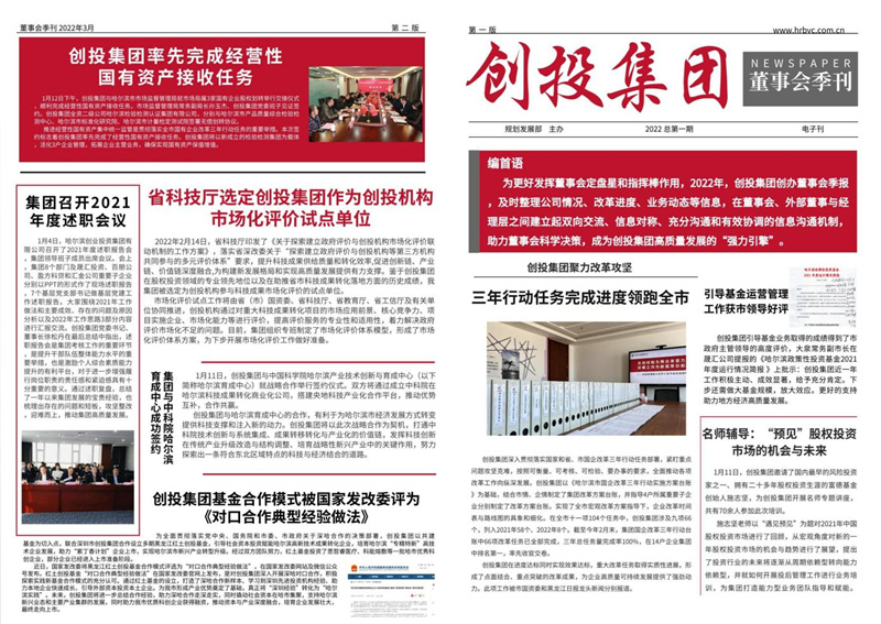 完善中國(guó)特色社會(huì)現(xiàn)代企業(yè)制度,形成科學(xué)有效的公司治理機(jī)制是《國(guó)企改革三年行動(dòng)方案》中八大重點(diǎn)任務(wù)中的第一項(xiàng),是國(guó)有企業(yè)推進(jìn)黨和國(guó)家事業(yè)發(fā)展的政治基礎(chǔ)。為進(jìn)一步提高創(chuàng)投集團(tuán)董事會(huì)工作質(zhì)效,保障董事會(huì)信息傳遞暢通,促進(jìn)董事會(huì)、外部董事與經(jīng)理層之間密切溝通、有效協(xié)調(diào),提高董事會(huì)的決策水平和決策效率,創(chuàng)投集團(tuán)創(chuàng)辦了董事會(huì)電子季刊,并于2022年3月出刊第一期。