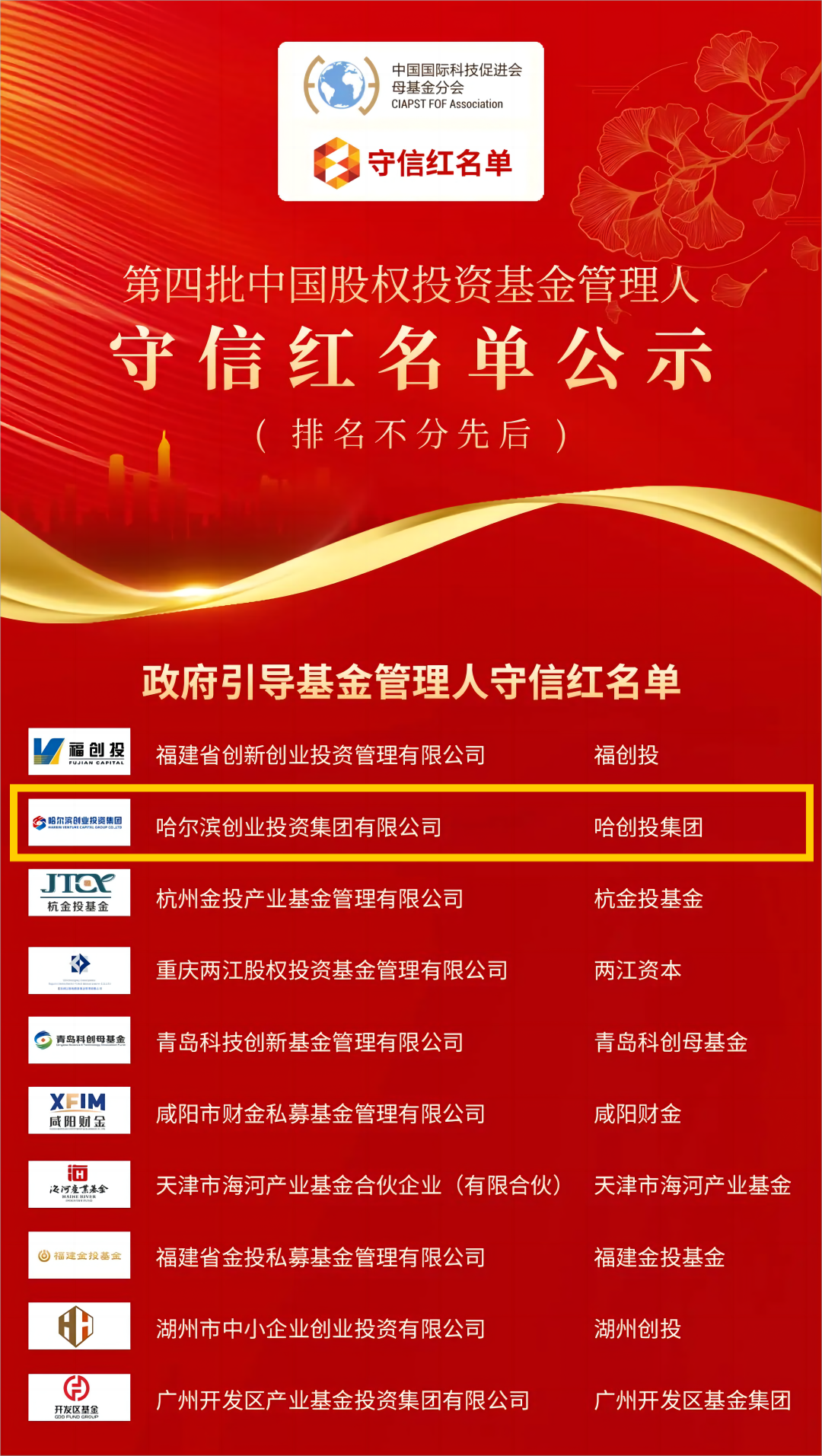 近日,“第四批中國股權(quán)投資基金管理人守信紅名單”已由中國國際科技促進(jìn)會母基金分會審核評定并公示完畢。哈爾濱創(chuàng)業(yè)投資集團(tuán)有限公司憑借在政府引導(dǎo)基金領(lǐng)域的持續(xù)深耕、出色的投資成效以及優(yōu)質(zhì)的管理服務(wù),成功上榜第四批中國股權(quán)投資基金管理人守信紅名單!